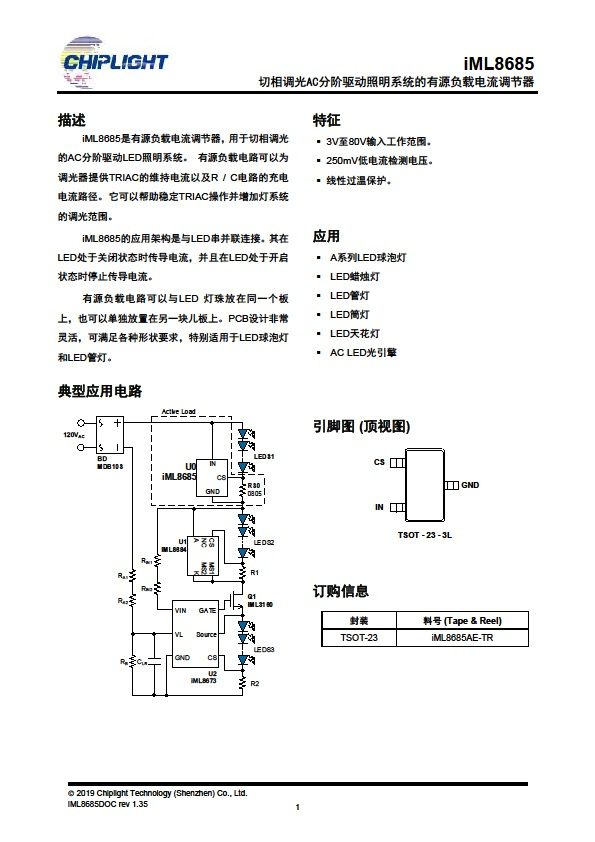 iML8685是有源負(fù)載電流調(diào)節(jié)器,用于切相調(diào)光的AC分階驅(qū)動LED照明系統(tǒng)。有源負(fù)載電路可以為調(diào)光器提供TRIAC的維持電流以及R/C電路的充電電流路徑。它可以幫助穩(wěn)定TRIAC操作并增加燈系統(tǒng)的調(diào)光范圍。