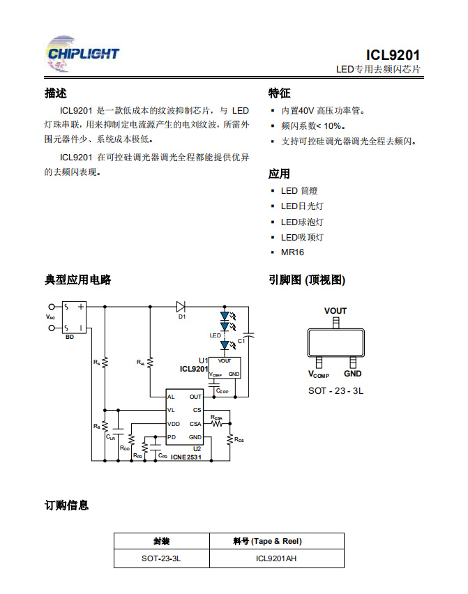 ICL9201是一款低成本的紋波抑制芯片,與LED燈珠串聯(lián),用來(lái)抑制定電流源產(chǎn)生的電劉紋波,所需外圍元器件少、系統(tǒng)成本極低。