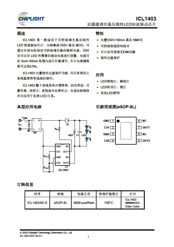 ICL1403 是一款適應于可控硅調光高壓線性LED 恒流驅動芯片,內部集成550V高壓MOS??赏ㄟ^外設電阻設定可控硅調光器的維持電流,同時也可以對 LED 所需要的驅動電流進行設置,電流可在 5mA~60mA 范圍內進行任意調節(jié),芯片電流精準度可達到+3%。