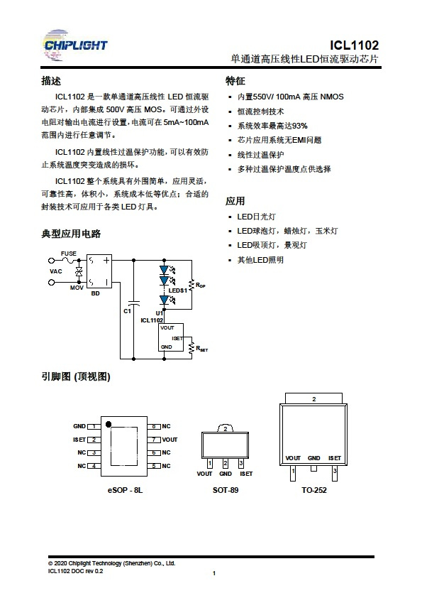 ICL1102 是一款單通道高壓線性 LED 恒流驅(qū)動(dòng)芯片,內(nèi)部集成 500V高壓 MOS??赏ㄟ^(guò)外設(shè)電阻對(duì)輸出電流進(jìn)行設(shè)置,電流可在 5mA~100mA范圍內(nèi)進(jìn)行任意調(diào)節(jié)。