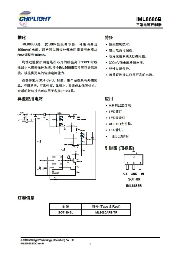iML8686B是一款500V恒流調節(jié)器,可驅動高達100mA的電流。用戶可以通過外部電阻將調節(jié)電流從5mA調整到100mA。
