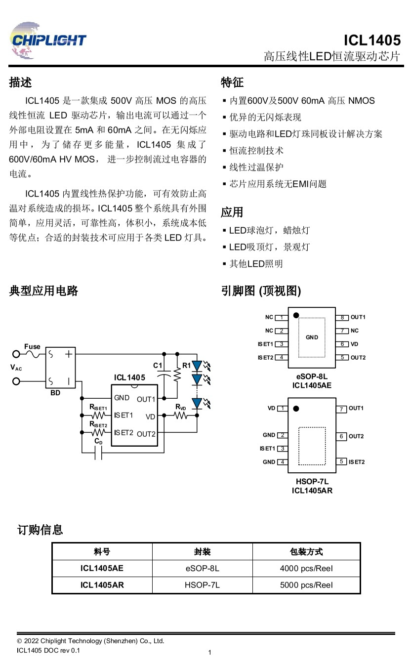 ICL1405 是一款集成 500V高壓 MOS 的高壓線性恒流LED驅(qū)動(dòng)芯片,輸出電流可以通過(guò)一個(gè)外部電阻設(shè)置在5mA和60mA之間。在無(wú)閃爍應(yīng)用中,為了儲(chǔ)存更多能量,ICL1405集成了600V/60mAHVMOS,進(jìn)一步控制流過(guò)電容器的電流。