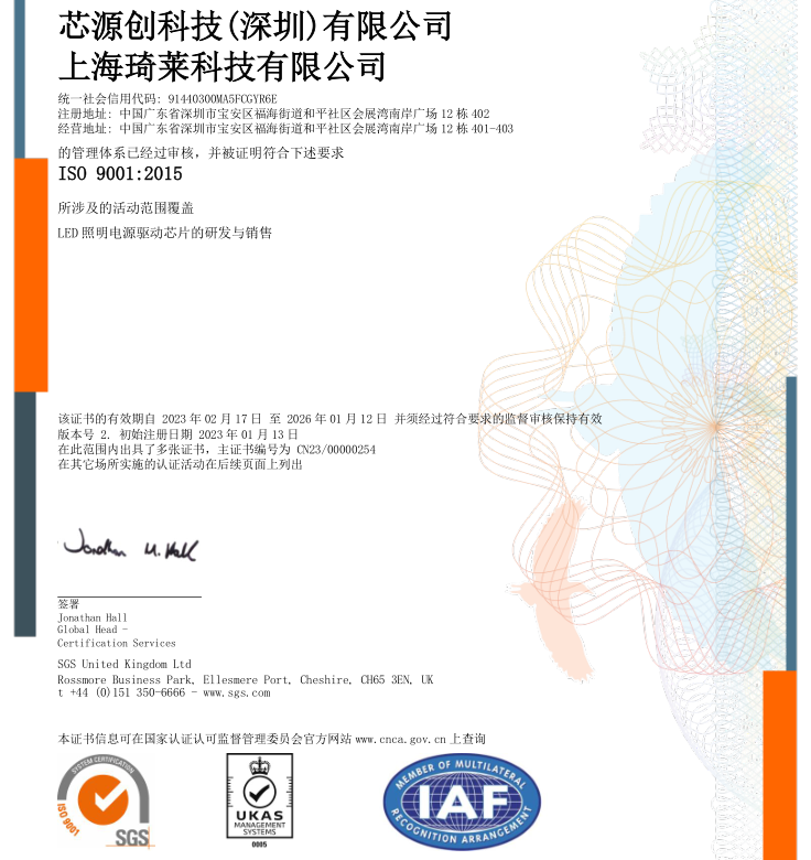 ? ? ? ?2023年2月17日,芯源創(chuàng)成功通過ISO9001質(zhì)量管理體系認證。這是對公司各項管理工作標準化、規(guī)范化的肯定,也是進一步提升企業(yè)管理體系,為公司規(guī)范制度、穩(wěn)健經(jīng)營、快速發(fā)展奠定堅實的基礎(chǔ)。