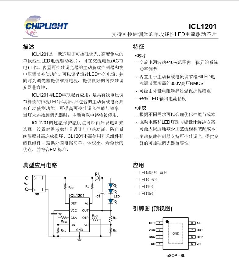 ICL1201是一款適用于可控硅調(diào)光、高度集成的單段線性LED電流驅(qū)動芯片,可在交流電壓(AC市電)工作。內(nèi)置可控硅調(diào)光器的主動負(fù)載控制器和線電壓調(diào)節(jié)補(bǔ)償功能,可以調(diào)節(jié)流過LED串的電流,并同時為調(diào)光器提供維持電流,提供良好的可控硅調(diào)光器兼容性。