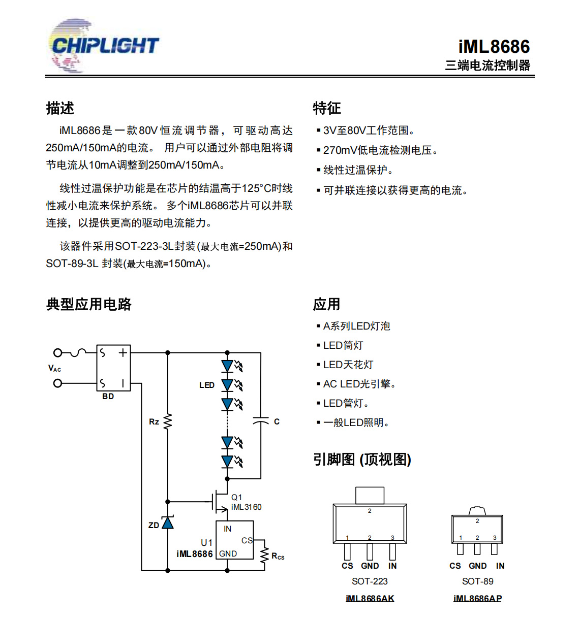 iML8686是一款80V恒流調(diào)節(jié)器,可驅(qū)動高達(dá)用戶可以通過外部電阻將調(diào)250mA/150mA的電流。節(jié)電流從10mA調(diào)整到250mA/150mA。