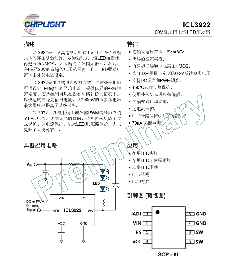壓范圍內(nèi)工作,LED驅(qū)動電流可由外部電阻設定。
